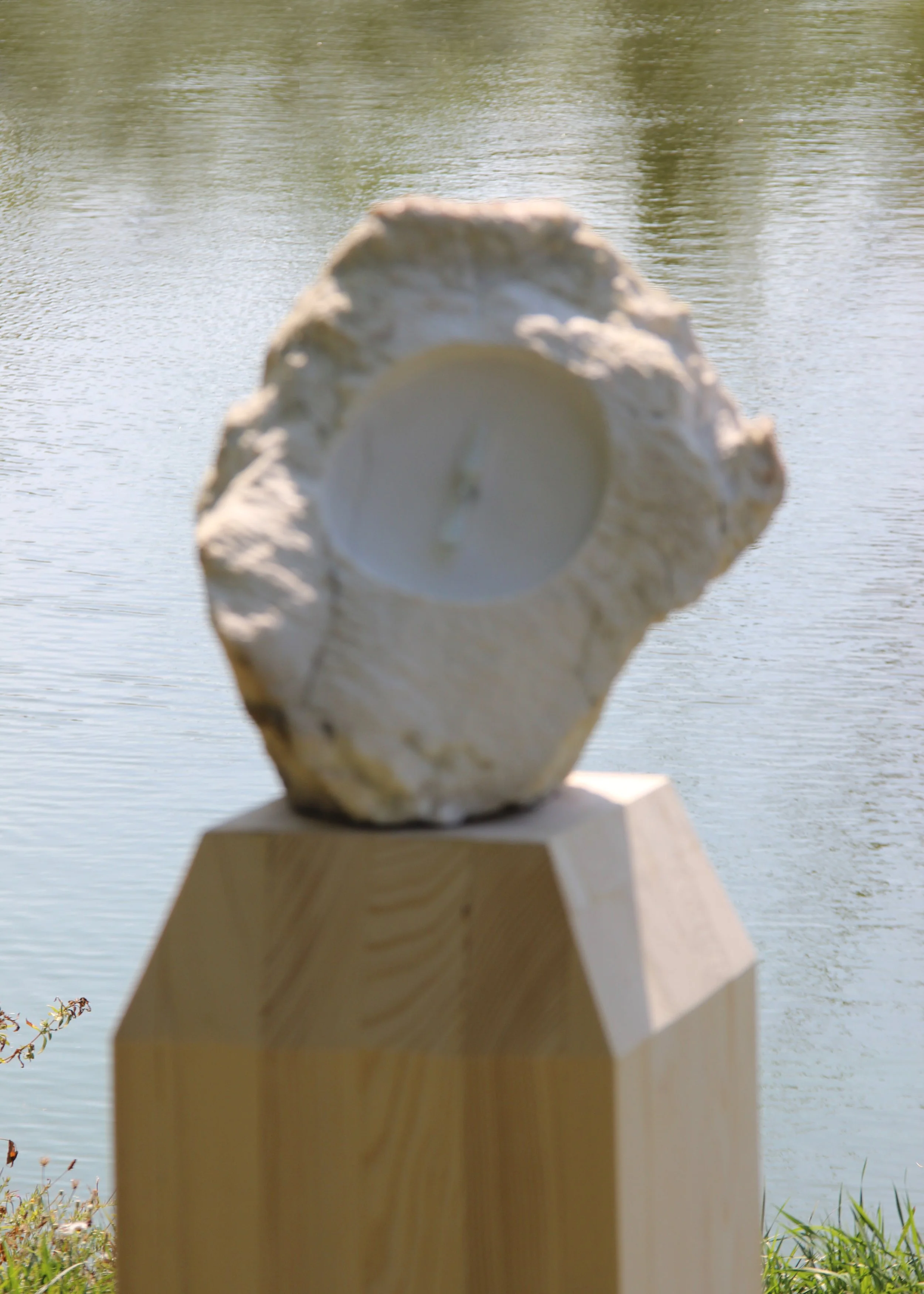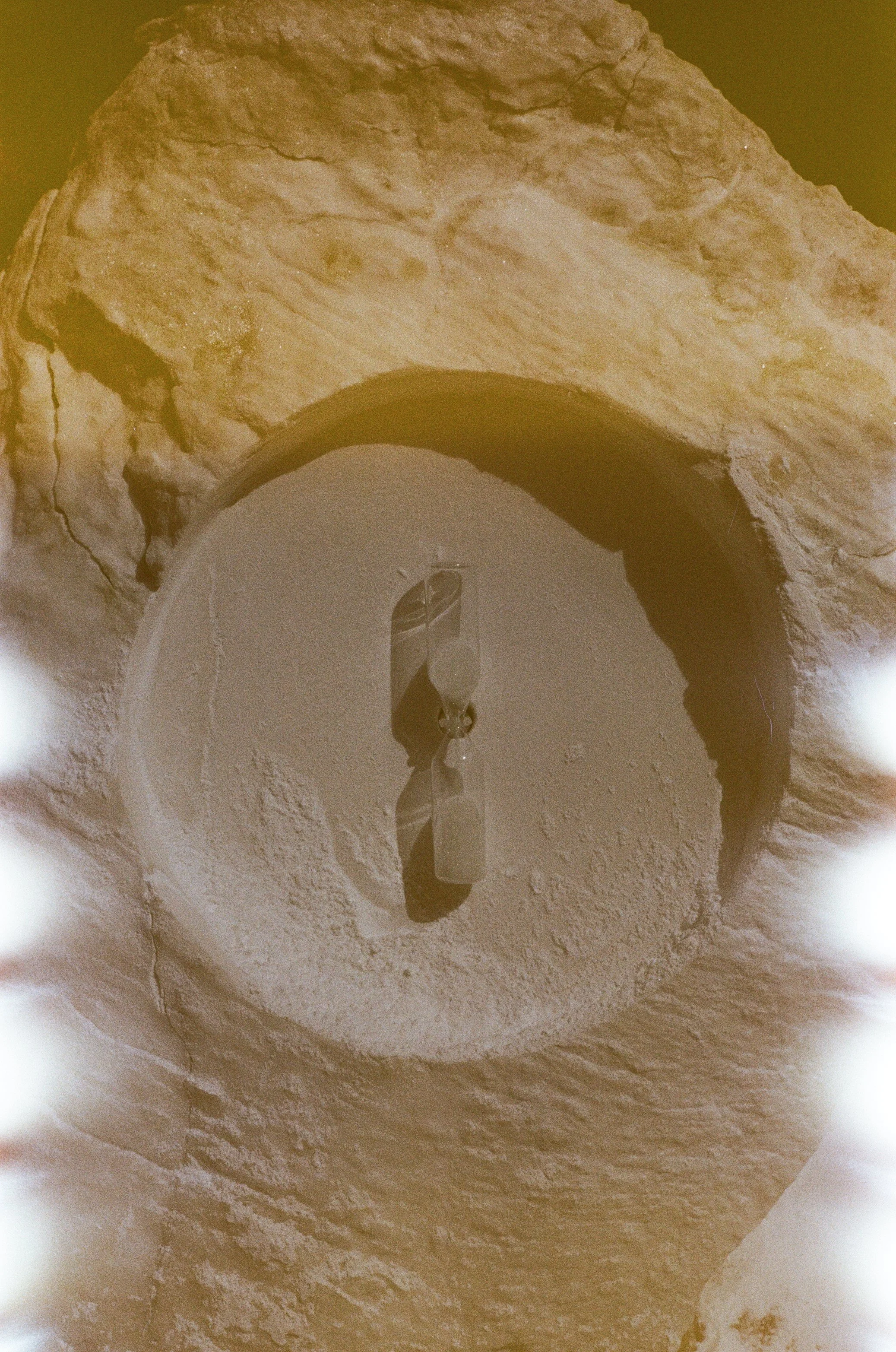 Aión attempts to explore this idea, showing endless time with an hourglass that is constantly being refilled. On the stone-carved clock face, similar to traditional clocks, the hand moves every second, which is unusually a sandglass fixed in the middle. In its constant cycle, the sandglass never runs out: instead of hours, it shows timelessness without beginning or end.