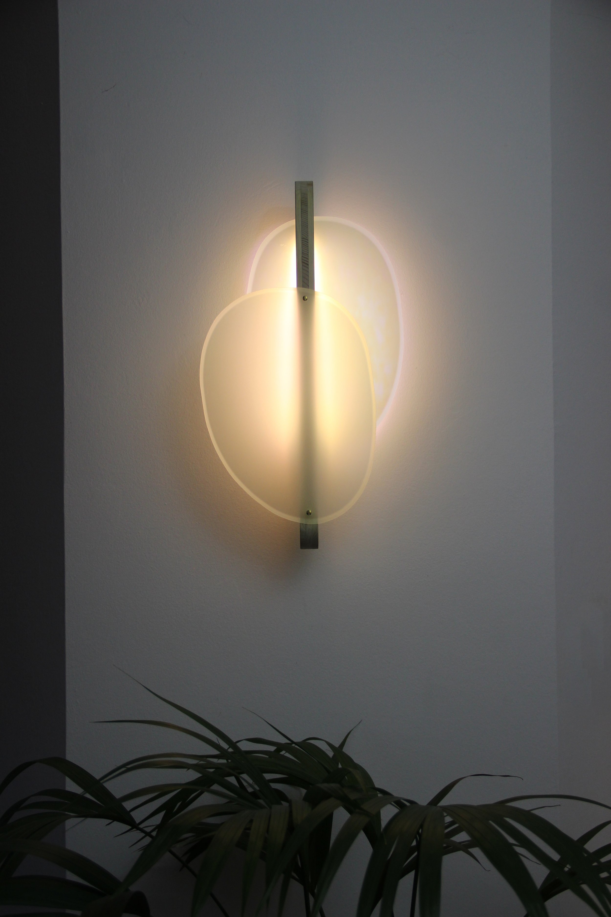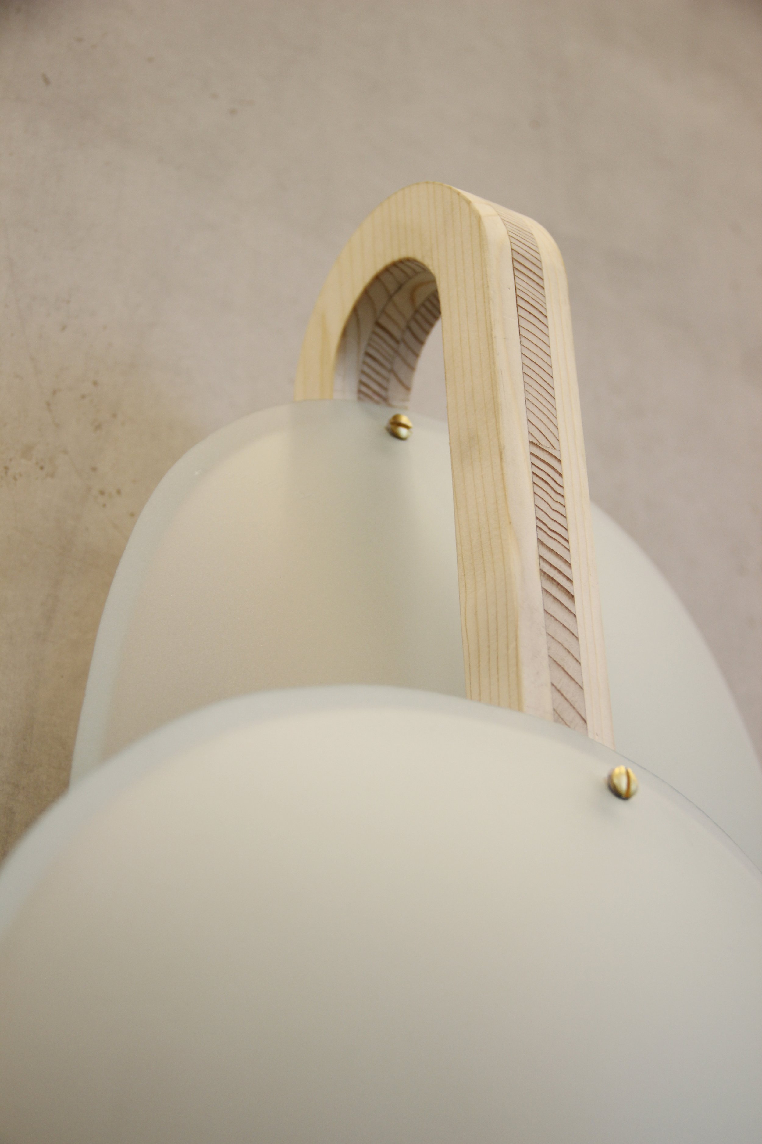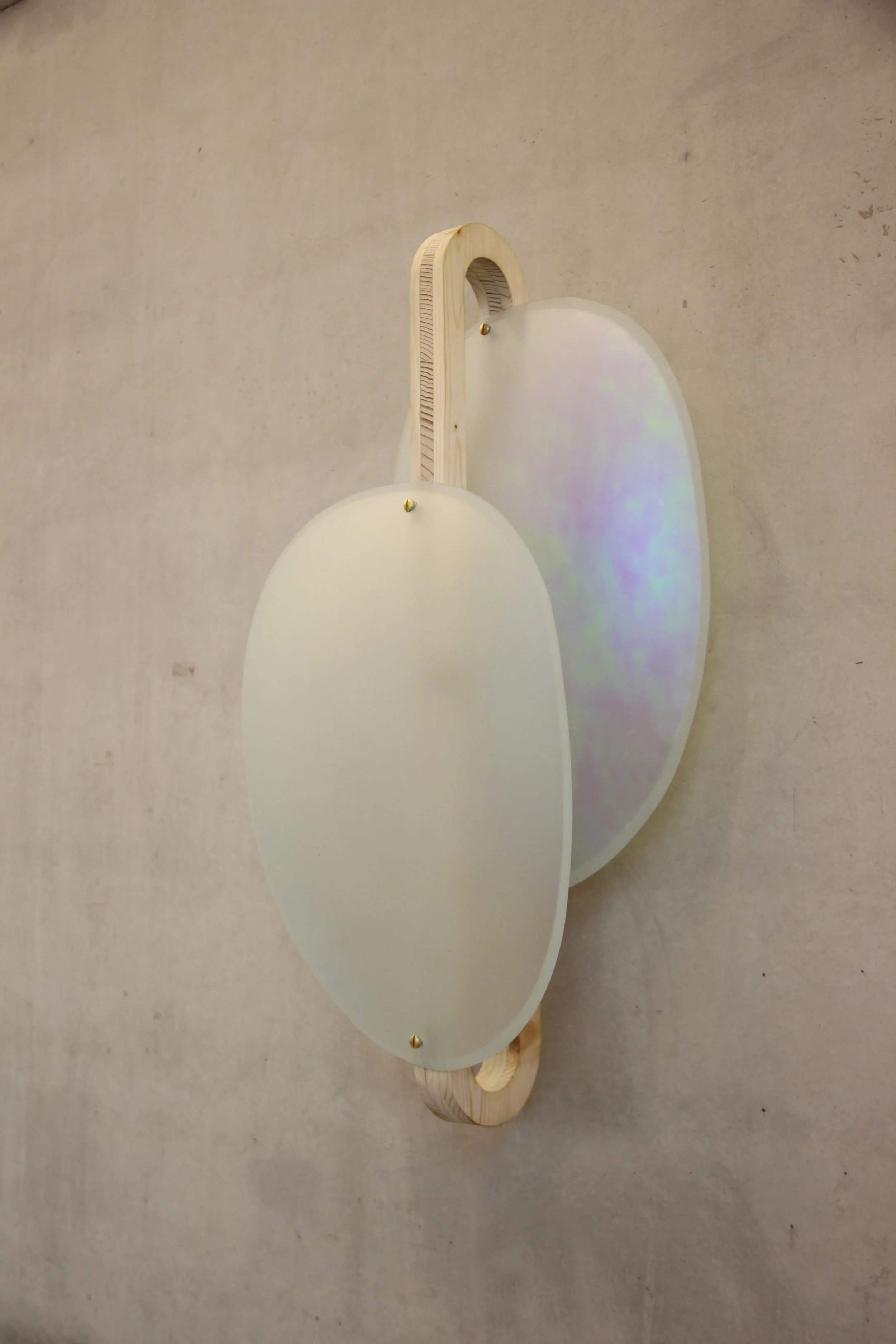 The finished object was named ‘Derengő’, and its light-emitting, curved glass seemed to float in front of the wall thanks to the wooden structure kept away from the wall. The warm white LED is projected on the wall by the glass colored purple-green, and the light is reflected through its opaque surface. As a result of the iridescent film, the lamp provides a different view from different angles.