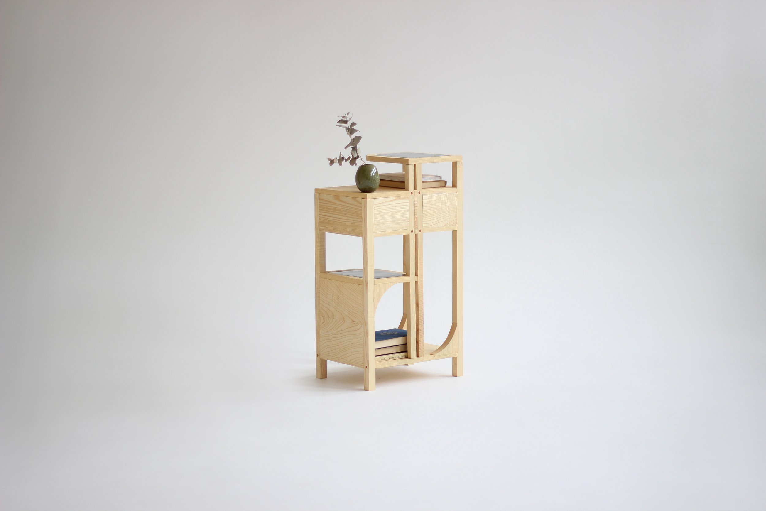 In connection with my furniture design, I dealt with the rethinking of ornamentation and the integration of craftsmanship. It was inspired by the Arts and Crafts movement, founded at the end of the 19th century, which was brought to life by thedrawback of the industrial revolution: the flood of low-quality goods created by factories and the alienating effect of monotonous factory work. Mass production has only expanded since then, and although I do not aim to distance myself from machine work, I believe that hand-worked details can add a lot to the ideological value and aesthetics of objects. During the design of the bedside table, I aimed to apply the traditional decoration in a contemporary way and strive for sophisticated detailed solutions. I completed the asymmetrical composition made of ash wood with ceramic plates and handle, which strengthen the handcrafted nature of the object.